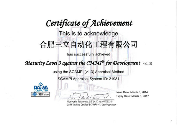 3月3日~3月8日,美國SEI評估機構(gòu)CMMI主任評估師Norishi Takimoto一行來我公司進行CMMI體系評估。經(jīng)過文檔審查、項目經(jīng)理訪談、EPG小組人員訪談等各個環(huán)節(jié),我公司順利通過CMMI 3級評估認證,并于3月8日上午由評估小組現(xiàn)場頒發(fā)CMMI 3級認證證書。