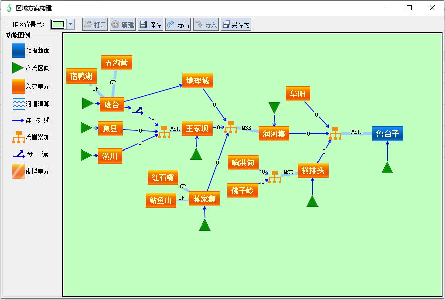 系統(tǒng)將集水區(qū)間、入流單元、預(yù)報(bào)斷面、虛擬斷面、河道等節(jié)點(diǎn)以不同的圖形概化成相應(yīng)的節(jié)點(diǎn)控件,通過(guò)拖拽各個(gè)節(jié)點(diǎn)控件,使用連接線可以構(gòu)造出流域中各節(jié)點(diǎn)間的關(guān)系,自動(dòng)設(shè)置各節(jié)點(diǎn)的屬性選擇預(yù)報(bào)模型和河道匯流方式。