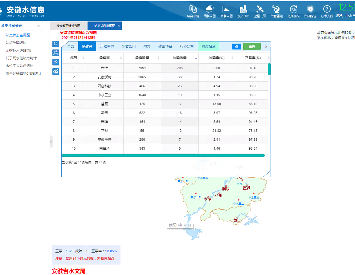 同時安排專人每日登陸安徽水信息網(wǎng)核查,超壩頂,超設(shè)計,低于死水位和未上線站點數(shù)據(jù),一經(jīng)發(fā)現(xiàn)問題站點立刻聯(lián)系項目負責(zé)人進行整改,保障上線后上線率長期保證在98%以上,同步我們公司整體運維項目的站點上報率為98%以上,均高于全省平均水平。