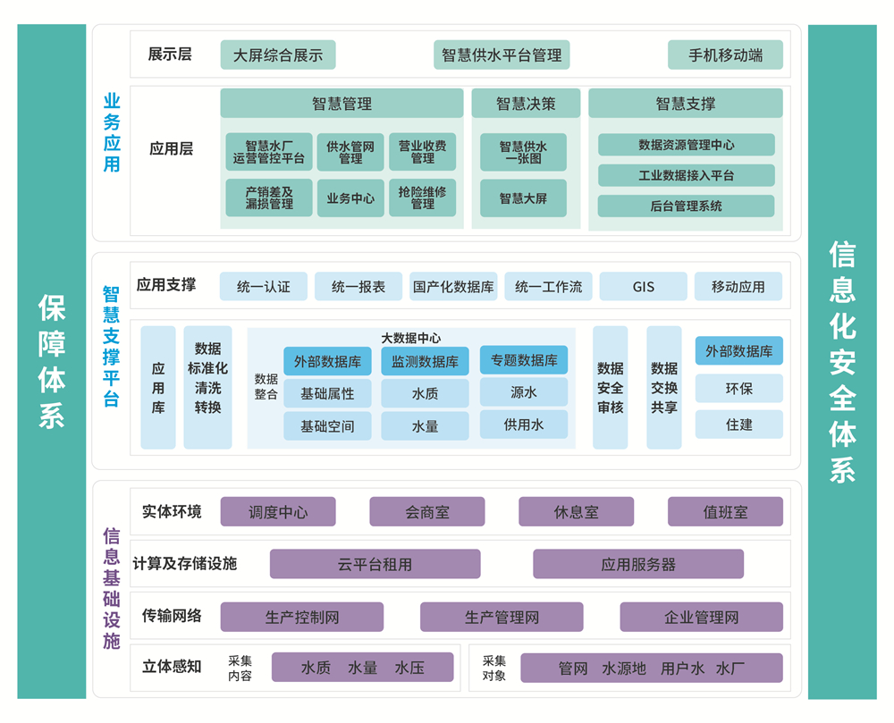 智慧水務平臺以信息化安全體系與保障體系為基礎支撐,構(gòu)建多層級架構(gòu)。信息基礎建設涵蓋實體環(huán)境、計算存儲設施、傳輸網(wǎng)絡及立體感知,采集水質(zhì)、水量等數(shù)據(jù)。智慧支撐平臺依托大數(shù)據(jù)中心,經(jīng)數(shù)據(jù)標準化流轉(zhuǎn)、整合等處理,借應用支撐服務助力應用層運作。應用層包含智慧管理、決策、支撐模塊,覆蓋水廠運營、管網(wǎng)管理等業(yè)務,最終通過展示層的大屏綜合展示、管理平臺及手機移動端,實現(xiàn)智慧水務全流程管控與高效服務,為供水業(yè)務數(shù)字化、智能化運營提供全面解決方案。