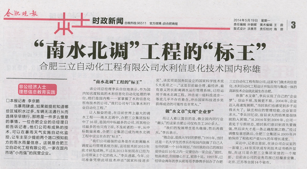 5月19日,《合肥晚報(bào)》在顯著版面以《“南水北調(diào)”工程的“標(biāo)王”》為題詳細(xì)報(bào)道了此次采訪過程;《合肥日?qǐng)?bào)》、《江淮晨報(bào)》也在顯著版面給予了報(bào)道。
